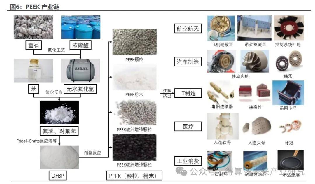 正在PEEK财产链中,从原资料到DFBP、PEEK,再到各范围最终产物必要过程众个设施:(1)萤石与浓硫酸反响天生无水氢氟酸;(2)操纵苯举办氟化反响天生氟苯和对氟苯;(3)氟苯和对氟苯过程催化、提纯等设施转化为DFBP;(4)DFBP缩聚反响天生PEEK集合物,通过抽提、蒸馏、水洗、干燥等工艺得到高分子量的PEEK纯树脂,每出产1吨PEEK集合物大约必要0.8吨的DFBP;(5)PEEK纯树脂中列入改性资料如石墨、玻璃纤维、碳纤维等可出产PEEK复合改性树脂,明显提拔PEEK纯树脂的职能,然后通过注塑、挤出等加工手腕创制片材、板材、零部件等成品,结果使用于各范围之中。目前,正在航空航天及汽车创制、IT创制业、医疗器材以及工业等范围,PEEK资料有着寻常的起色空间和墟市使用,已被邦度和地方政府列为核心扶助起色的高科技财产。